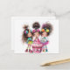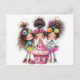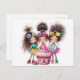 Tarjeta postal de felicitación de cumpleaños colorida con 3 chicas extravagantes con una tarta de cumpleaños