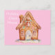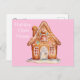 Escena tradicional de Navidades de una encantadora casa de pan de jengibre con un alegre fondo rosa. Tradicional con un toque moderno para compartir en las festividades de temporada. Apropiado para todas las edades y géneros.