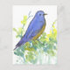 Una postal decorada con un pájaro azul brillante sobre un arbusto de sagebrush ilustrado con tinta sepia y acuarela. Inspirado por el ave estatal de Nevada y la flor del estado de Nevada.