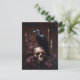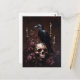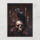 Un cuervo negro se perfila encima de un cráneo humano rodeado de rosas rojos y púrpura, ramas espinosas y velas brillantes