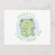 Una rana triste y llorosa con un pañuelo mojado y haciendo adiós. La leyenda del juego de palabras dice "¡Adiós, no te olvidaré!" Una tarjeta de bienvenida de despedida para un amigo o colega que se va a algún lugar lejos.