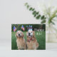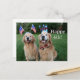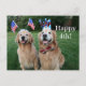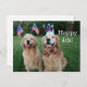 ¡Feliz 4 de julio, EE. UU.! Muestra tu espíritu patriótico con esta postal de golden retriever adorable. El diseño presenta una fotografía de dos perros celebrando el Día de la Independencia con banderas rojas, blancas y azules, corbata de moño y diademas. El texto es totalmente personalizable.