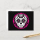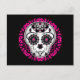Mi versión de un lindo cráneo de azúcar en blanco, rosa caliente y negro con muchos acentos elegantes en un fondo de coordinación. Se muestra aquí en una postal.