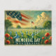 Aquí hay una tarjeta postal de viaje vintage con estilo de acuarela para el Día de los Caídos (EE. UU.), con una escena solemne de recuerdo con filas de cruces blancas en un cementerio militar pacífico, amapolas rojas en flor y una gran bandera estadounidense ondeando en la brisa. 🇺🇸🕊️✨ El diseño tiene colores suaves y desvanecidos y tipografía vintage nostálgica, creando una apariencia sincera y respetuosa.