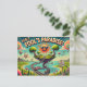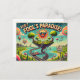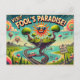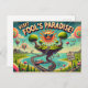Esta es la graciosa y caprichosa postal de viaje para el Día de los Inocentes de abril, que presenta un paisaje surrealista con islas flotantes, árboles al revés y un camino giratorio. 😂 😜 ✨ El cielo está lleno de nubes de dibujos animados y peces voladores, mientras que un sol tonto, sonriente, con lentes de sol vientos al espectador. La tipografía atrevida y juguetona dice "¡Visita el paraíso de los tontos!", creando una extraña e imaginativa atmósfera.
