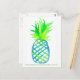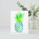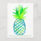 Una postal en honor al Día Internacional de la Piña el 27 de junio con una piña estilizada pintada con acuarela en varios matices de verde brillante y azul con un patrón de entramado.