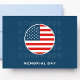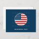 Esta postal presenta un diseño llamativo con un fondo azul atrevido, superpuesto con la palabra repetida "RECORDAR" creando un patrón de texto vertical que simboliza la esencia del Día de los Caídos. En el centro, un emblema circular muestra la bandera estadounidense, presentando un sentido de orgullo nacional y recuerdo. La tipografía limpia y moderna en la parte inferior dice claramente "DÍA DE LOS CAÍDOS", lo que hace que este diseño sea un tributo respetuoso y una pieza gráfica contemporánea.