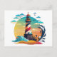 El 7 de agosto es el Día Nacional del Faro. El ilustracion cuenta con un faro de rayas rojas, blancas y negras con olas, arena y aves marinas.