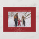 Difunde alegría, Navidad más alegre. Celebra la temporada con esta tarjeta postal de superposición de foto familiar, saludo de temporada rojo oscuro, con este tema de escritura contemporáneo moderno minimalista. Está totalmente personalizada y se puede personalizar con sus propios mensajes de saludo. Por favor, agregue su dirección de devolución para facilitar el envío. Es simple, fácil, pero moderno minimalista y festivo. Esta es la tarjeta postal perfecta para enviar sus deseos de vacaciones. Feliz Navidad.