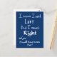 Esta graciosa postal azul es el regalo perfecto para papá, novio o amigos que simplemente no pueden resistir una buena discusión sobre direcciones! Presentando el ingenioso eslogan, "Sé que dije A LA IZQUIERDA, pero me refería a lo correcto y ¡deberías haberlo sabido!", esta divertida postal capta la frustración humorística de perderse en un desacuerdo con la conducción. Es ideal para los que no pueden evitar tener razón —incluso cuando claramente no lo están. Un chiste divertido y descarado, esta postal de este argumento de conducción azul seguramente la hará reír. Creado por The Sweetmans, es un saludo perfecto y alegre para compartir con los seres queridos con problemas de dirección en tu vida.