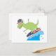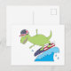 Postal Dinosaur surfista con bandera americana