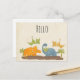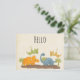 Una postal de hola con un diseño bonito con 4 dinosaurios. 2 están volando y 2 están en el suelo. Creado con acuarelas.