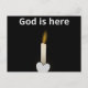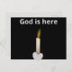 Esta es una hermosa postal inspiradora con el mensaje "Dios está aquí" impreso en letras plateadas sobre una vela tibia que sale de un lindo corazón plateado sobre un fondo negro. Genial enviar a cualquiera que necesite de Fe.