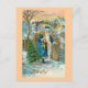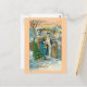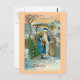 Deliciosa tarjeta de Navidades suecos que muestra a Santa Claus llegando a una puerta del jardín con un gran saco de regalos y juguetes.