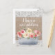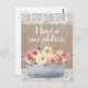 Burlap rústico y cambio de encaje blanco de postal de dirección con una metalizado maceta florida llena de hermosas flores color azul y rosa oscuro y color crema de las acuarelas.