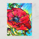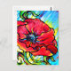 amapola roja con hojas verdes de fondo amarillo y verde azulado, acrílico en lienzo del artista Nada Meeks