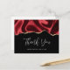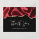 Tarjeta de agradecimiento con un diseño de raso falso. Rojo oscuro con pliegues y un borde de purpurina dorada.