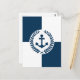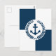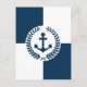 Diseño de temática náutica con decoración de coronas de ancla y laurel sobre fondo geométrico azul y blanco