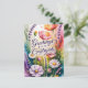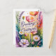 Una vibrante y alegre ilustración digital vertical diseñada como una tarjeta de saludo botánica. La composición presenta una mezcla ecléctica de flores silvestres, incluyendo cosmos blancos y lavanda, ramitas altas de lavanda púrpura y amapolas cálidas rosadas y naranjas. Centrado en el medio está la frase "Saludos desde el campo" escrita en una elegante letra cursiva púrpura profundo con florituras ornamentadas. El fondo es un magistral toque de pinceladas de acuarela en teal, magenta y amarillo, creando una atmósfera pastoral brillante y aireada.