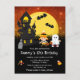 Esta divertida y espeluznante invitación de cumpleaños presenta una linda bruja y un fantasma junto a una casa embrujada torcida. Al fondo hay una luna llena con murciélagos y un cielo nocturno naranja con estrellas. El texto combina fuentes decorativas y serif para un look elegante y moderno. Esto es perfecto para Halloween.