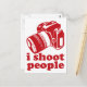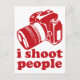 ¡Disparo A La Gente! ¿Tienes tu atención? Ahora relájate, disparo a la gente, pero con una cámara. Parece que en estos días todos son fotógrafos. Pero no puedo culparlos. ¿A quién no le gusta la fotografía? Con un producto como una cámara digital fácilmente disponible, no puedes evitar ser uno. Tengo este diseño en negro, rojo y azul. También he puesto este diseño en una variedad de productos que van desde camisetas hasta tazas y botones. Así que, tómate el tuyo ahora y muéstrale al mundo lo que haces...
