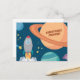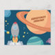 Postcard con un divertido diseño del espacio exterior con planetas, cohetes y estrellas. Tiene un texto que dice Greetings Friend pero que se puede personalizar.
