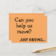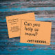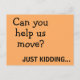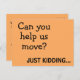 Este es un simple diseño de texto minimalista con dos tipos de letra y un chiste sarcástico y gracioso de un tipo de línea en la parte delantera que dice: ¿Puedes ayudarnos a movernos? Sólo es broma...sobre un vibrante fondo naranja. La parte trasera dice: ¡Pero lo conseguimos! Por favor, tome nota de nuestra nueva dirección, y hay una plantilla de texto para que añada su nueva dirección o puede eliminarla y escribirla a mano. #newaddress