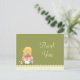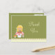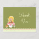 Esta adorable fiesta de cumpleaños de chicas gracias postal tiene un tema de hadas. Hay un hada con el pelo rubio sentado en una seta con un pequeño ratón debajo. El fondo es de color verde oliva con polkadots. La parte inferior tiene un borde de vieiras de color crema con una franja rosa. Copyright © Zenware Designs com