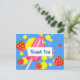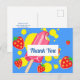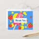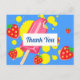 Una tarjeta postal de agradecimiento para una fiesta con un tema veraniego. Diseñada con una paleta rosa y algunas fresas rojas y salpicaduras de pintura amarilla. Fondo azul.