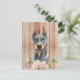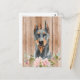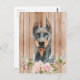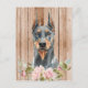 Realista ilustracion de retrato de acuarela de perro Doberman con spray de bonito floral sobre fondo de panel de imitación de madera.