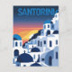 Esta postal captura la serena belleza de Santorini, Grecia. El ilustracion destaca las emblemáticas iglesias de cúpula azul y los pueblos encalados que se asoman al acantilado, mientras que el sol se pone sobre el mar Egeo como telón de fondo. Es un diseño pintoresco y elegante, perfecto para compartir la belleza de esta famosa isla griega.