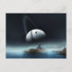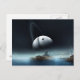 Ilustracion de un mundo extraterrestre orbitando un planeta de anillo.