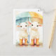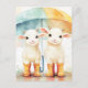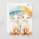 Dos cabras bebé tienen puestas sus botas de lluvia y se paran bajo un paraguas fantasía acuarela arte