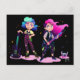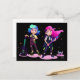 Dos músicos chicas tocan guitarras de rock juntos. Sonríen y se sienten alegres. El azul está usando pantalones elegantes en una jaula y tirantes al estilo punk con una camiseta Mickey Mouse. Red lleva un traje elegante y brillante que enfatiza su personalidad. El ilustracion es luminoso y alegre, con personajes maravillosos llenos de armonía y felicidad. Hacen un maravilloso dúo musical.
