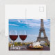 Dos copas de vino tinto con tentempiés con vistas a París y la Torre Eiffel. Vidrio de vino tinto con diferentes tentempiés - plato con jamón, rebanado, queso azul. Pareja, celebración romántica. Cafetería con vistas.