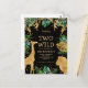 Esta invitación de tarjeta postal para una fiesta de segundo cumpleaños con tema de safari de la jungla "dos salvajes" presenta animales de lámina dorada falsa (jirafa, león y monos), follaje de la jungla dorado y verde, y un toque de confeti dorado sobre un fondo negro. Agregue el nombre del niño o niña cumpleañero y los detalles de la fiesta en texto negro en el anverso y su dirección de respuesta en el reverso.
