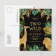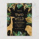 Esta invitación de tarjeta postal para una fiesta de cumpleaños número dos con tema de safari de la jungla "dos salvajes" presenta animales de lámina dorada (jirafa, león y monos), follaje de la jungla dorado y verde, y un toque de confeti dorado sobre un fondo negro. Agregue el nombre del niño o niña de cumpleaños y los detalles de la fiesta en texto negro en el anverso y su dirección de respuesta en el reverso.