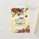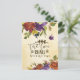 Tarjeta de felicitación de boda de otoño con cita inspiradora de las escrituras que representa una hermosa aguaflora rústica de otoño con flores moradas, naranja quemada y amarillas y vegetación. Incluye el versículo bíblico Génesis 2:24, "Y los dos se harán uno".