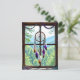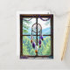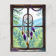 Boho postal para saludar y mantenerse en contacto con un amigo o miembro de la familia. Una rústica ventana de madera con un rayón blanco, naranja y morado colgado en la ventana junto con una hilera de cristales coloridos. La ventana da a una bella escena de bosque y montañas.