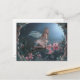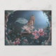 Tarjeta de fantasía con un hada soñadora sentada en una rama cubierta de flores.