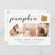 Esta tarjeta postal de anuncio de bebé es perfecta para presentar a tu pequeño bebé de otoño. También puedes enviarla como tarjeta de vacaciones de Acción de Gracias y tarjeta de agradecimiento para baby shower. El diseño simple pero elegante presenta tres de tus fotos familiares favoritas y una mezcla de tipografía moderna y elegante con letra manuscrita. También hay una imagen de una adorable calabaza para acompañar el texto.