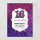 Un elegante y elegante fiesta dulce de 16 años salva la postal de la fecha. Diseñado con un fondo compuesto de piedras brillantes rosas y violetas. Enlosado sobre la parte superior es un marco elegante en blanco y negro. Dentro del marco están tus detalles personalizados así como una imagen que dice Sweet 16 con purpurina y destellos dentro del texto.