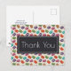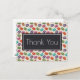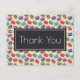 Una tarjeta postal de agradecimiento con un patrón adorable de macarons en muchos colores diferentes con un patrón de lunares tenue detrás. Superpuesta en la parte superior hay un rectángulo negro con las palabras: Gracias escritas dentro. Mensaje personalizado en la parte posterior.