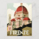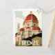 Afiche de viaje europeo de ilustracion vintage o etiqueta de equipaje de Florencia, Italia con la Catedrale di Santa Maria del Fiore, la Catedral de Florencia o el Duomo. Arquitectura religiosa clásica italiana.