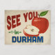 Una encantadora postal de viaje de Durham, Carolina del Norte, con una hermosa manzana roja, junto con un divertido texto de estilo retro que dice, "Nos vemos en Durham"