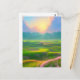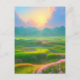 En esta obra de arte digital, el amplio campo verde parece haber sido pintado con los cepillos más tiernos, con trazos suaves y suaves. La serenidad del césped verde se ve acentuada por la presencia de flores rosadas por todos lados. La vista es impresionante, sobre todo cuando se mira hacia el horizonte donde el cielo se encuentra con las montañas. El sol se pone detrás de las nubes onduladas, creando un resplandor rosa y dorado que cubre todo el paisaje. Es como si el mundo se hubiera detenido, y te quedaras solo con este impresionante momento de la naturaleza.