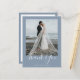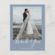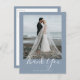 Boda gracias postcard presenta un elegante tipo de letra con un diseño tipográfico moderno y limpio con un fondo azul polvoriento. Esta tarjeta está lista para que usted pueda personalizar con su propia foto y detalles.