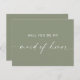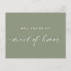 Encanta a tu mejor amigo con esta elegante tarjeta verde sabrosa y polvorienta preguntando "¿Serás mi empleada de honor?" Presenta un diseño limpio y minimalista y una tipografía refinada, que evoca una estética suave inspirada en la naturaleza. Ideal para los temas del jardín, el bosque, el botánico o el boda rústico, especialmente en primavera, verano o principios de otoño. Personaliza con nombres o un mensaje sincero para hacer el momento aún más especial.
