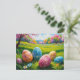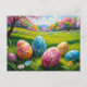 This Easter postcard was designed with an artistic feel. The eggs are made to look like paper quilling and the colors are pastel. The background is a lush meadow popping with Spring colors and blooms. The back of the postcard has a powder blue background with a "Happy Easter" graphic in script typography. There is still room to write a personal greeting. The back of the card also features address lines and stamp box in matching color.