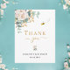 Una moderna y elegante ducha de bienvenida. Un fondo blanco moda. Decoradas con flores blancas, flores (peonía) y hojas de eucalipto de color verde acuático, estribos, vegetación y brotes de oro falsos. Letras negras y doradas. Al frente del texto: Gracias, nombre y fecha. Parte posterior: plantilla para su nota de agradecimiento y nombre.